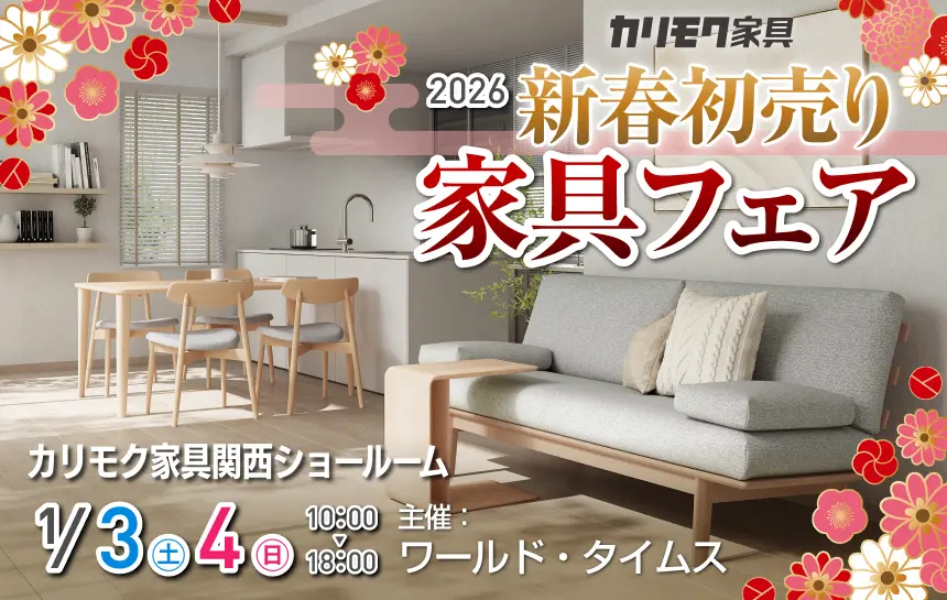 会場:カリモク家具 関西ショールーム開催日:2026年01月03日 〜 01月04日国内生産にこだわった高品質なカリモク家具の関西ショールーム。新作モデルを始め定番商品のソファやダイニングセット・TVボ…