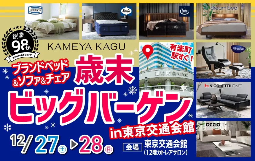 創業約100年の老舗家具屋 亀屋家具が一流ブランドベッド&ソファ&チェアの歳末ビッグバーゲンを限定開催!