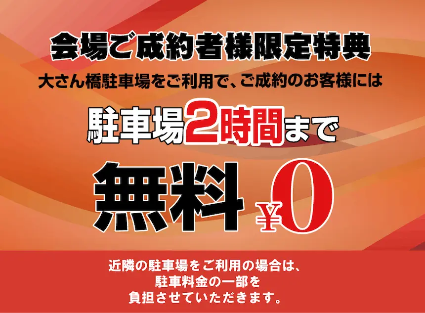 大さん橋客船ターミナル駐車場無料券プレゼント! 会場でご成約の方に大さん橋客船ターミナル駐車場2時間無料券をプレゼント! ※他の駐車場は料金の一部を負担いたします。 |