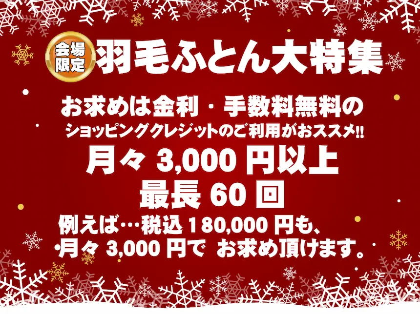 会場特別金利クレジットシステム 最長36回までの分割クレジットが金利・手数料が無料でご利用頂けます。※当社指定クレジットとなります。 |
