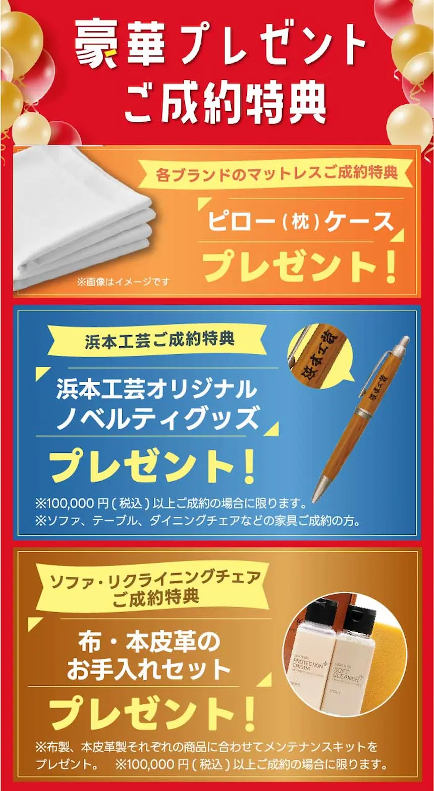 【成約特典】 浜本工芸のソファ、テーブル、ダイニングチェアなどの家具ご成約で 「浜本工芸オリジナルのノベルティグッズ」プレゼント! ※10万円(税込)以上ご成約の場合に限ります。 |